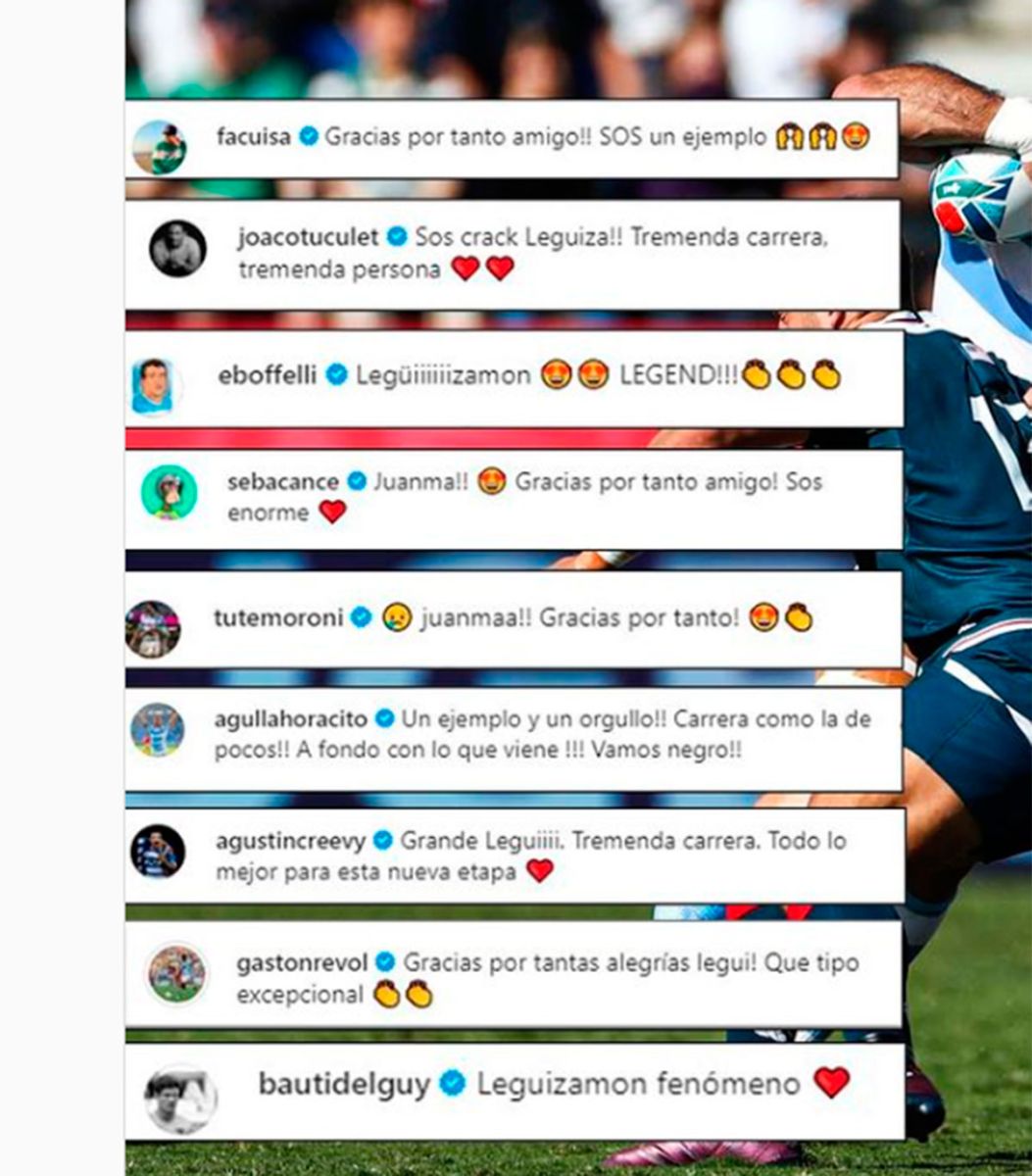Uno de los primeros en aparecer fue Agustín Creevy que, a través de un comentario en Instagram, expresó: "Grande Leguiiii. Tremenda carrera. Todo lo mejor para esta nueva etapa". Mientras que Matías Moroni y Emiliano Boffelli escribieron: "Juanmaa!! Gracias por tanto!" y "Legüiiiiiizamon LEGEND!!!", respectivamente.