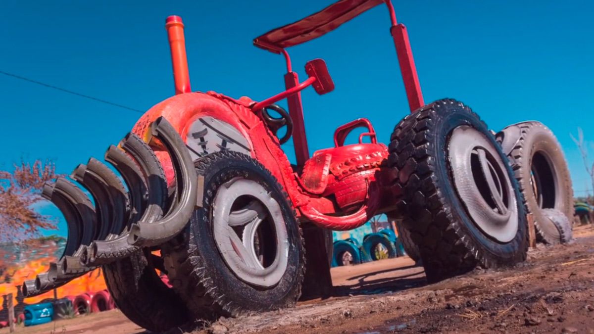 En el parque interactivo hay formas realizadas con los neumáticos, siendo los más llamativos los dinosaurios, el helicoptero, la tortuga, entre otros divertidos personajes; y también crearon mesas, sillas y espacios comunes para descansar.
