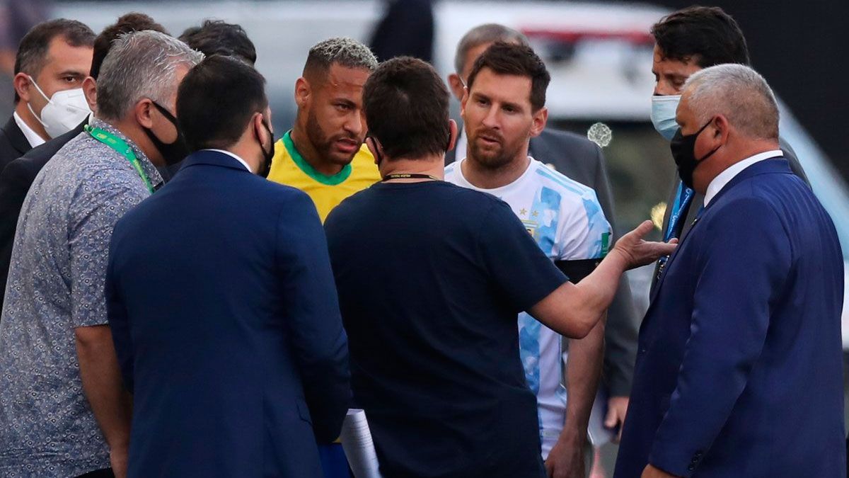 El encuentro fue suspendido el 5 de septiembre pasado a los 5m. del primer tiempo en el Neo Química Arena de San Pablo por el ingreso a la cancha de las autoridades sanitarias locales, que pretendían que Emiliano "Dibu" Martínez, Cristian "Cuti" Romero, Emiliano Buendía y Giovani Lo Celso abandonaran el campo de juego y fueran deportados del país, acusados de haber falseado sus declaraciones de ingreso al territorio brasileño.