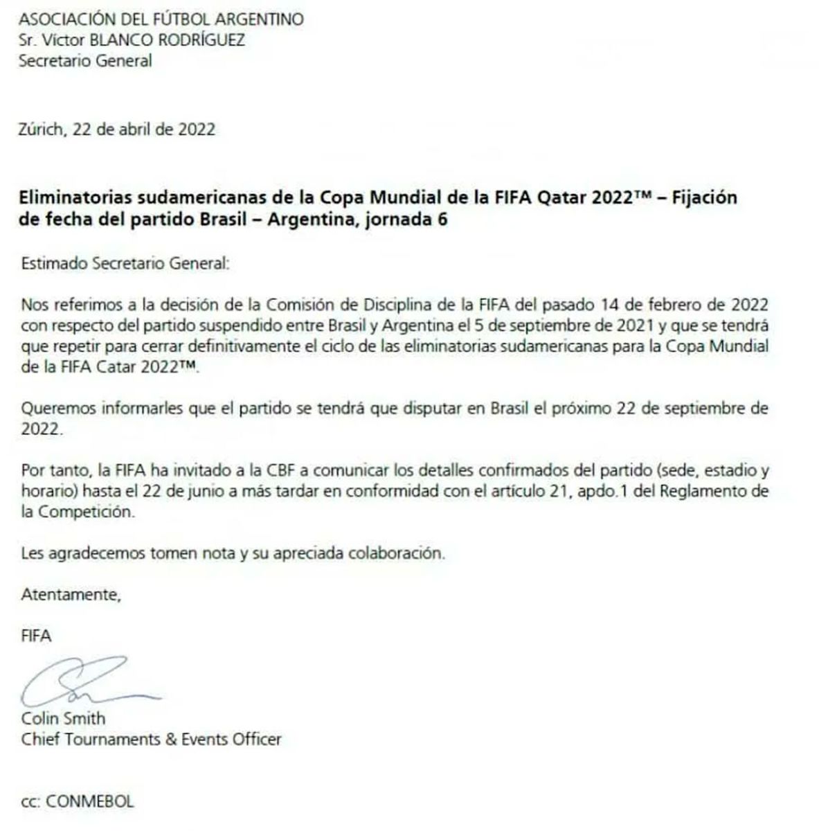 El seleccionado argentino de fútbol, clasificado al Mundial de Qatar, disputará ante Brasil, el 22 de septiembre, de visitante, el superclásico sudamericano correspondiente a la sexta fecha de las Eliminatorias que fue suspendido el año pasado, dispuso hoy la FIFA.
