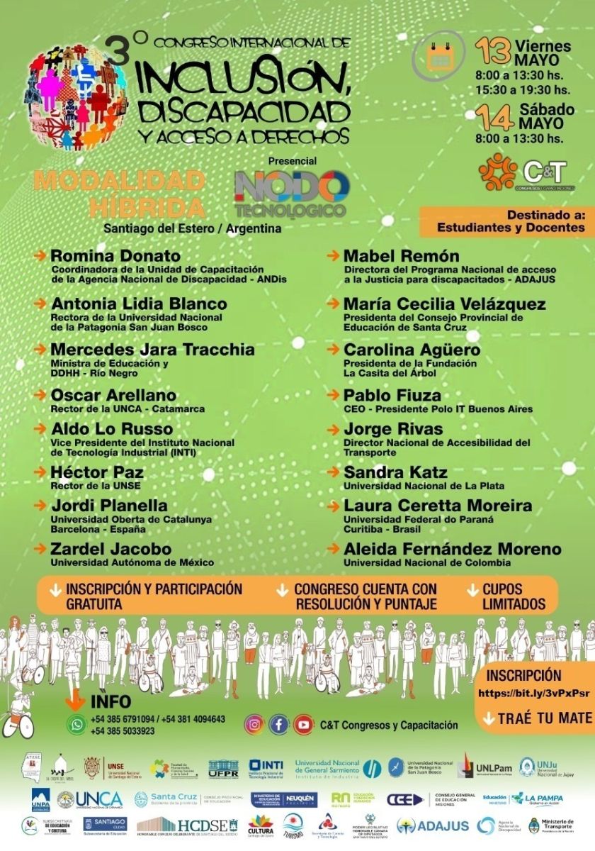 El viernes 13 y sábado 14 de mayo se realizará en las Instalaciones del Nodo Tecnológico, el III Congreso Internacional de Inclusión, Discapacidad y Acceso a Derechos:“La educación como pilar de una sociedad igualitaria e inclusiva",organizado y Coordinado por CyT Consultora, ATESE (Asociación de Trabajadores de la Educación de Santiago del Estero) y con el Auspicio de la Universidad Nacional de Santiago del Estero.