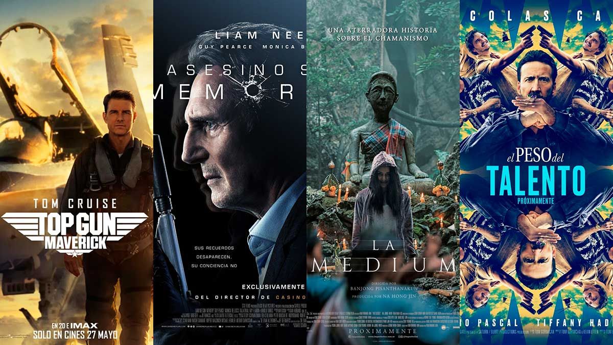 Se trata de "Top Gun: Maverick", nueva entrega del clásico de los 80 protagonizado por Tom Cruise; de la nueva cinta de acción protagonizada por Liam Neeson "Asesino sin memoria"; de la cinta de terror tailandesa "La Medium" y de "El peso del talento", comedia de acción que encabezan Nicolas Cage, Pedro Pascal y Demi Moore.