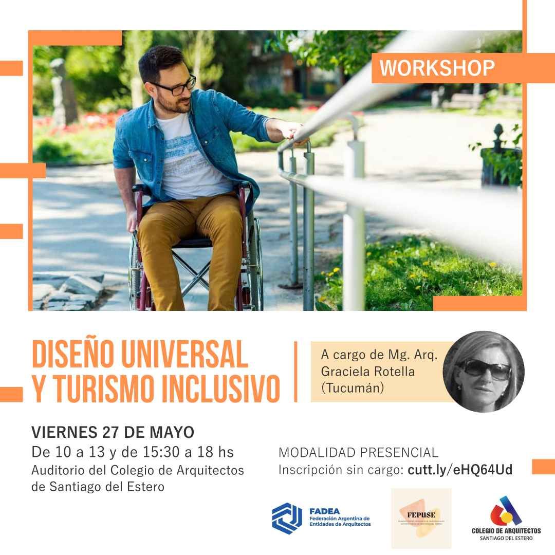 El Colegio de Arquitectos de Santiago del Estero junto a la FEPUSE, organiza el Workshop: Diseño Universal y Turismo Inclusivo, que estará a cargo de la Mg. Arq. Graciela Rotella destacada especialista del tema proveniente de Tucumán.