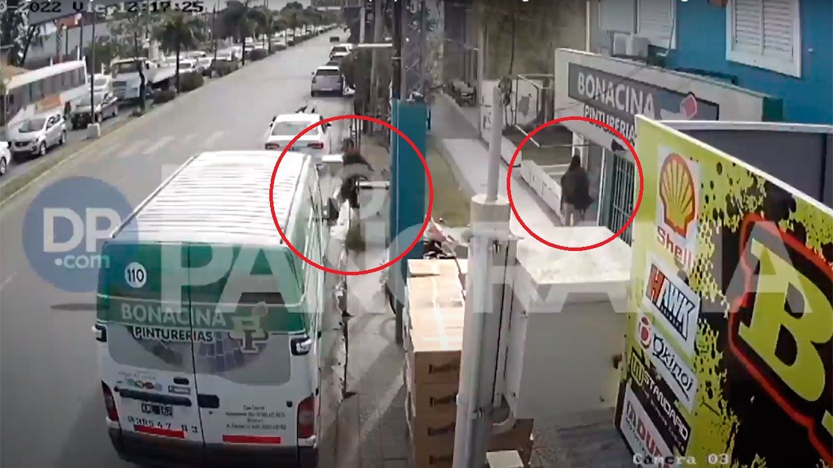 El momento exacto en el que los dos delincuentes que maniataron, golpearon y -fuertemente armados- asaltaron al propietario de un negocio de perforaciones escapan con 200 mil dólares en efectivo fue captado por cámaras de seguridad de la zona.