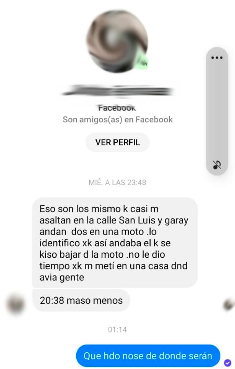 Un posteo en la red social Facebook tras el ilícito, permitió además revelar que este sujeto tiene antecedentes delictivos en la vecina ciudad, cuando una joven relató que merodean por Garay y San Luis junto a un cómplice asaltando transeúntes, y que ese mismo día, horas antes, intentaron robarle aunque no lograron su cometido.
