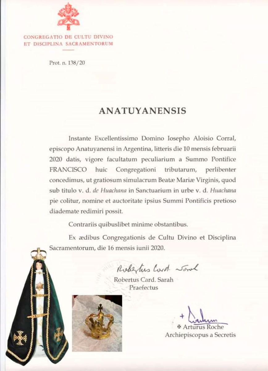 La noticia fue dada a conocer a través de la página oficial del Santuario de la Virgen de Huachana, donde compartieron el documento pontificio que llegó a la Diócesis de Añatuya.