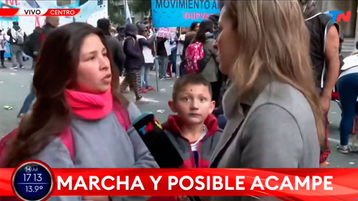 La mujer estaba junto a su hija de cuatro años, que estaba durmiendo en un cartón en el piso en medio de los bombos y ruidos de la concentración, cuando se le acercó la periodista Sandra Borghi para preguntarle qué reclamaban.