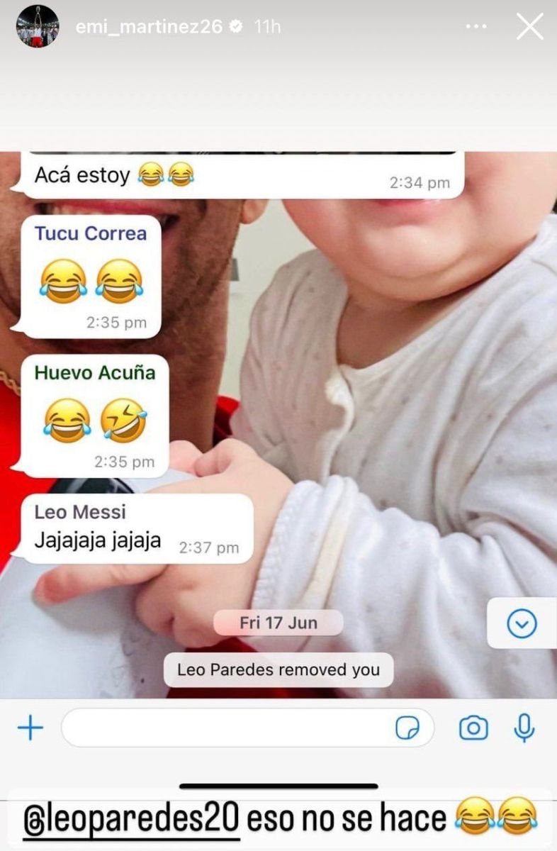 La broma no quedó allí, ya que el arquero subió una historia donde se ve la captura de pantalla del chat y escribe: “Eso no se hace”, y lo etiquetó al jugador del PSG. La captura compartida por el Dibu además tuvo una curiosidad que se convirtió en tendencia: entre los mensajes previos a la "expulsión" había uno de Messi que decía "jajajaja jajaja", que se convirtió en tendencia en redes sociales: "Si Messi se ríe así, entonces hay que reirse así".