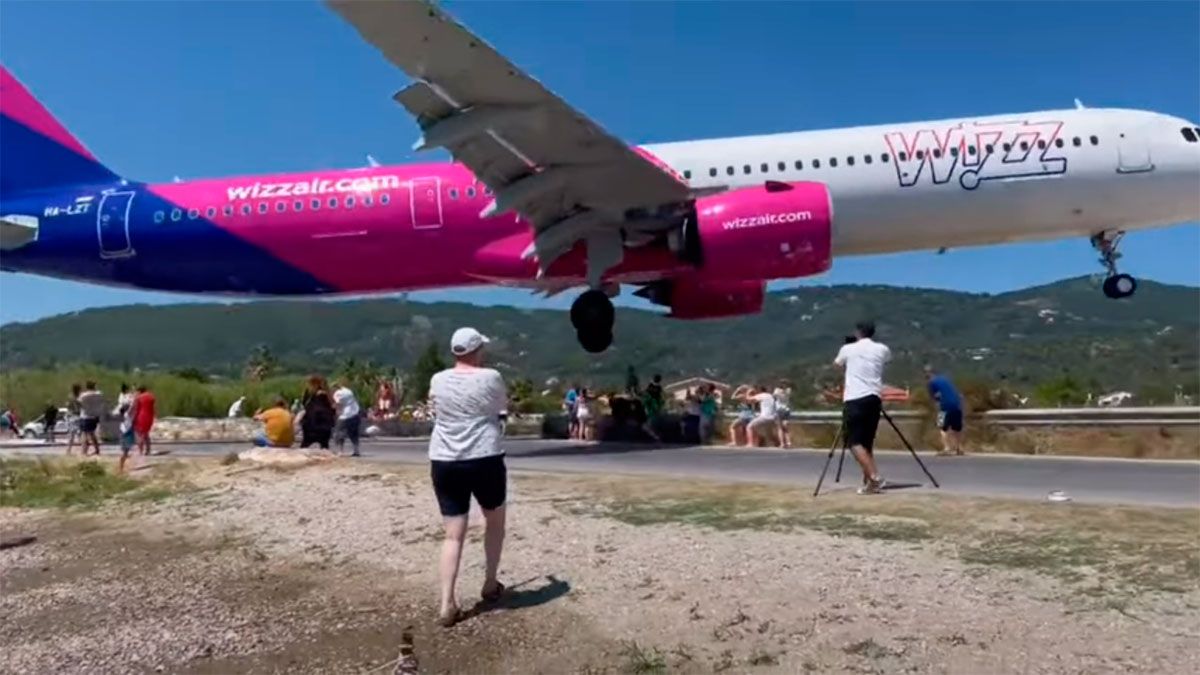 Las imágenes muestran el Airbus A321 neo de la compañía Wizz Air acercándose a la pista de la isla de Skiathos, un popular destino turístico en el Mar Egeo, el pasado jueves.