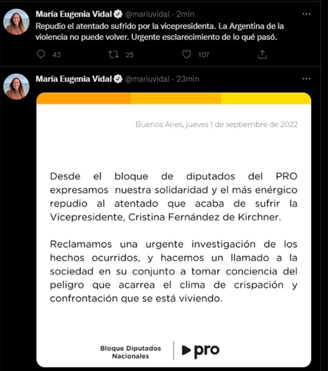 María Eugenia Vidal se unió al repudio contra el atentado a la vicepresidenta Cristina Fernández de Kirchner. En este sentido, compartió un comunicado oficial en nombre del bloque de diputados de Juntos por el Cambio, donde llaman a urgente investigación e instan a la sociedad a tomar conciencia.