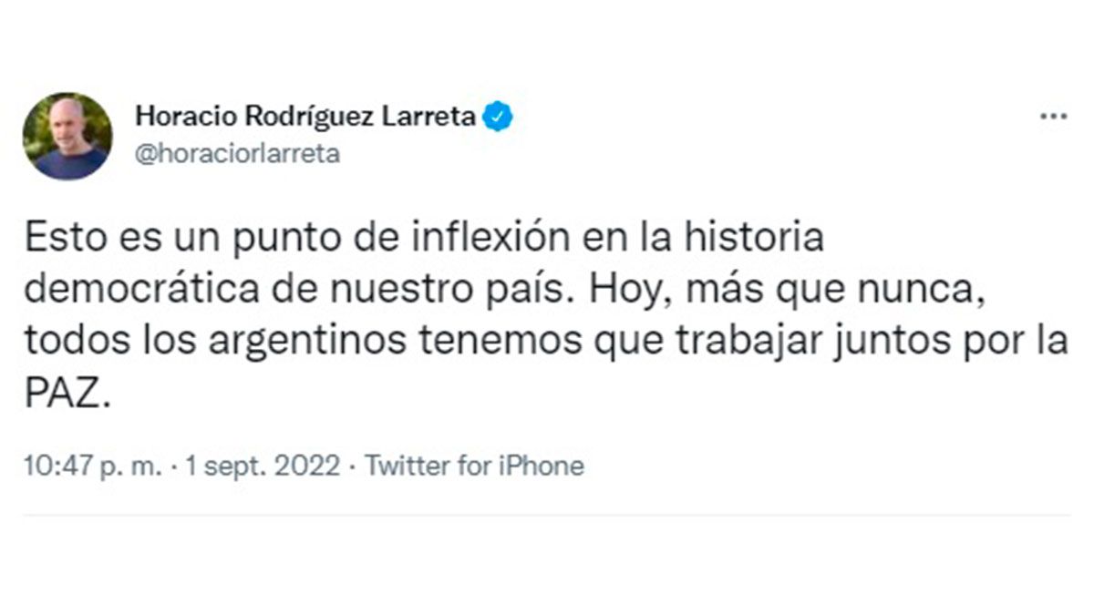 Horacio Rodriguez Larreta publicó en su cuenta de Twitter un mensaje repudiando el intento de asesinato a la Vicepresidente Cristina Fernandez de Kirchner.