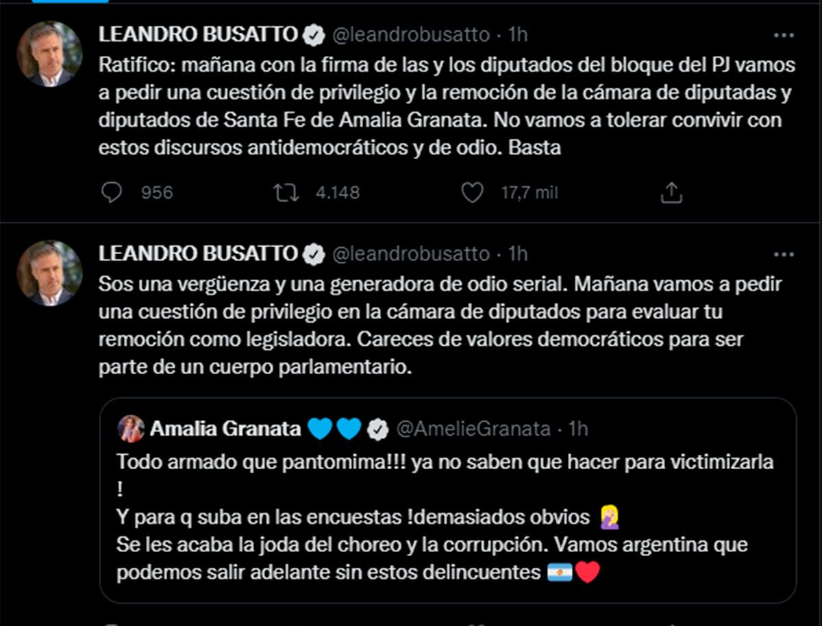 Tras el tweet de la diputada, Busatto le respondió tildandola de “una vergüenza y una generadora de odio serial.” y ratificó que no van a tolerar convivir con discursos de antidemocráticos.
