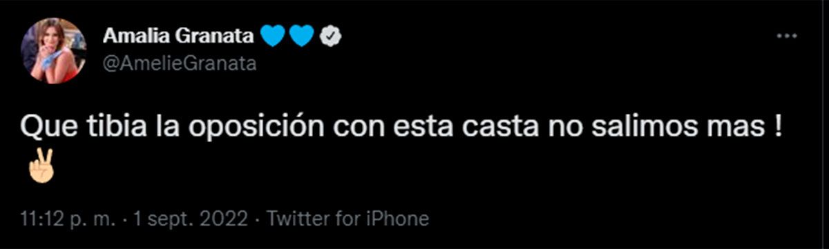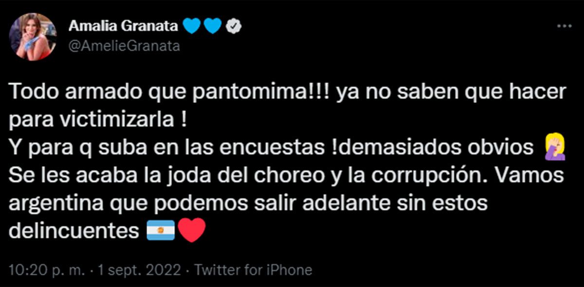 La diputada provincial de Santa Fe, Amalia Granata, se expresó a través de Twitter en relación al atentado contra la vida de la vicepresidenta de la Nación, Dra. Cristina Fernández de Kirchner, y generó polémica tras referirse al hecho de violencia como “Todo armado que pantomima!!! ya no saben que hacer para victimizarla !”.