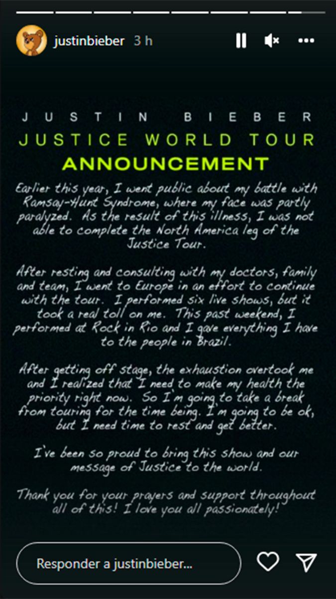 A principio de año el joven artista había comunicado su padecimiento a través de las redes sociales, luego de haber sufrido una parálisis facial de manera parcial. En este sentido se vio obligado a posponer su “Justice World Tour”.
