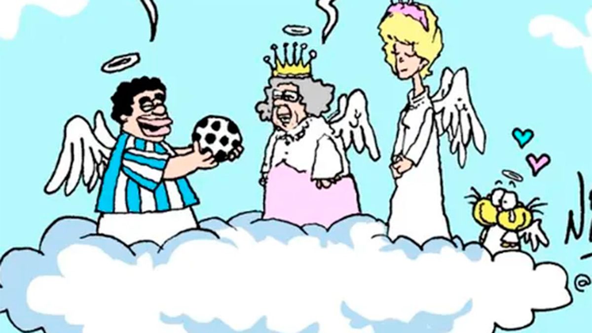 Nik, el historietista argentino, difundió un posteo con una imagen tras la muerte de la reina Isabel II. El creador de Gaturro realizó en Twitter una ilustración simbólica en el que aparece Diego Maradona, la monarca británica y Lady Di en el cielo.