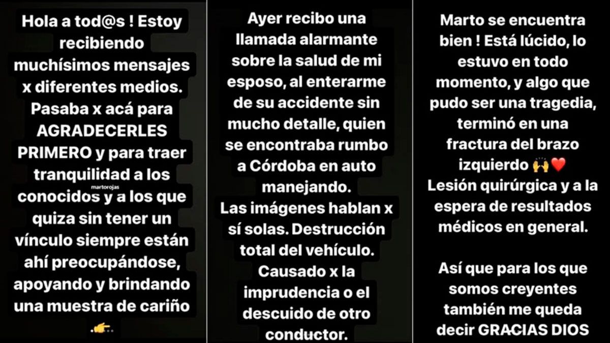 “Marto se encuentra bien, está lúcido, lo estuvo en todo momento, y algo que pudo ser una tragedia terminó en una fractura del brazo izquierdo. Lesión quirúrgica y a la espera de resultados médicos en general”, explicó sobre el estado de salud de su pareja. Consternada por el choque, hizo un llamado a la reflexión sobre la importancia de la buena conducta al volante: “Tomar conciencia de nuestros derechos, pero también de nuestras obligaciones al salir a la calle se vuelve una medida indispensable; miles de accidentes viales podrían evitarse si se respeta al otro, y respetarnos es fundamental no solo para mantener nuestra propia integridad física, sino también para salvar vidas”.