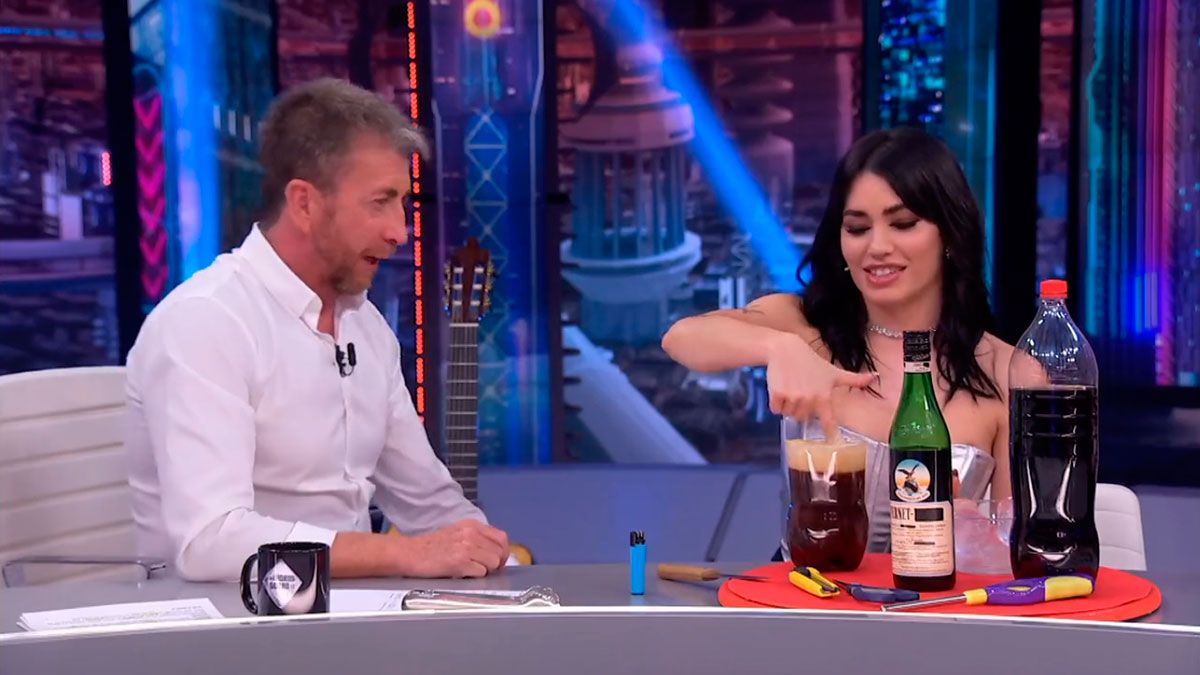 Tras preparar el fernet en la botella cortada, Lali le hizo probar el trago a Motos. “Este es el cáliz y te bendigo con el trago más argentino de la historia. Yo Lali, una popstar argentina, te bendigo Pablo Motos, rey de la televisión española, con este trago”.