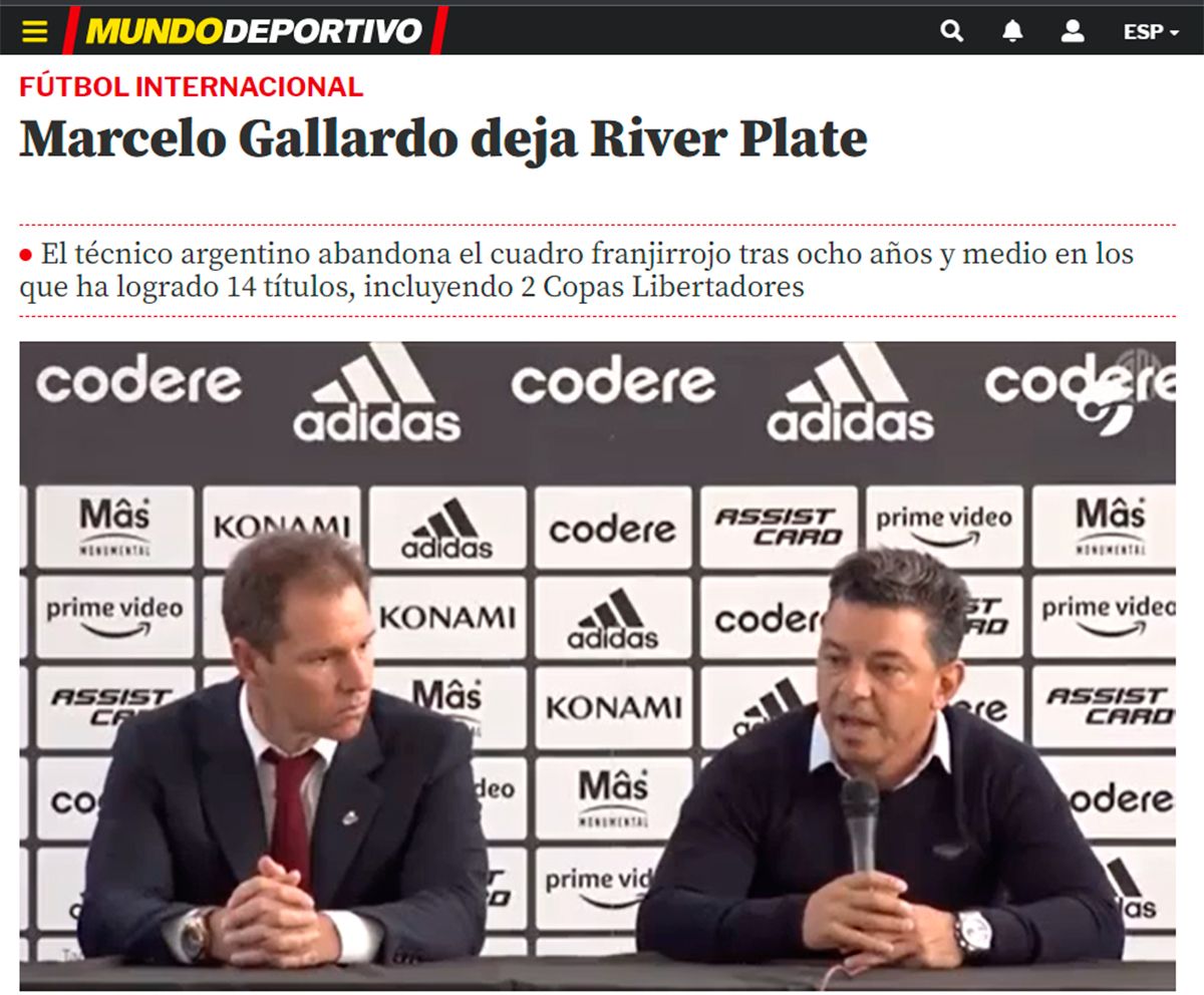 "Gallardo deja River: 'El camino ha sido extraordinario'", tituló As, mientras que en Marca escribieron: "Bombazo en Argentina: el técnico argentino Marcelo Gallardo ha anunciado en el día de hoy en una conferencia de prensa que no seguirá siendo entrenador de River Plate, club al que llegó en el año 2014".