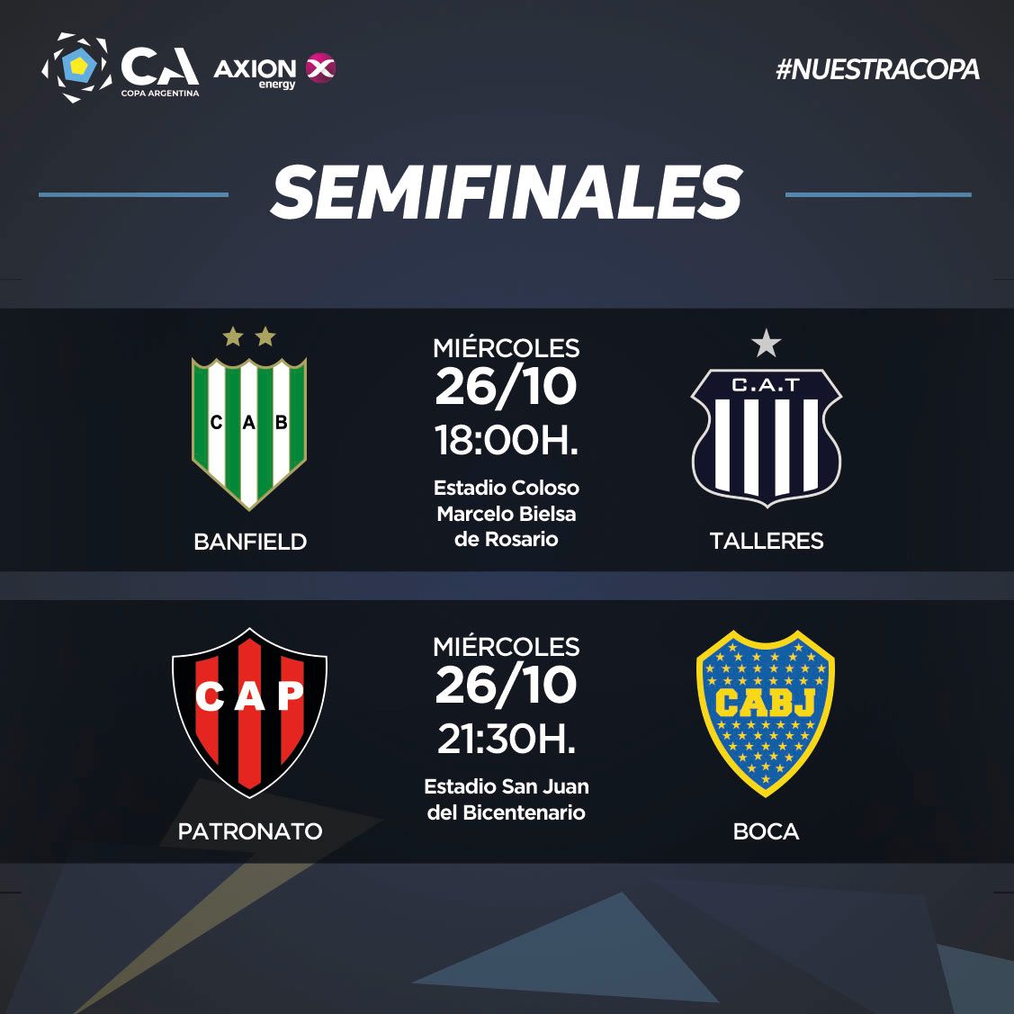 La organización de la Copa Argentina confirmó que las semifinales Boca Juniors vs. Patronato y Banfield vs. Talleres se disputarán en San Juan y Rosario, respectivamente. Ambos partidos serán el próximo miércoles 26 de octubre.
