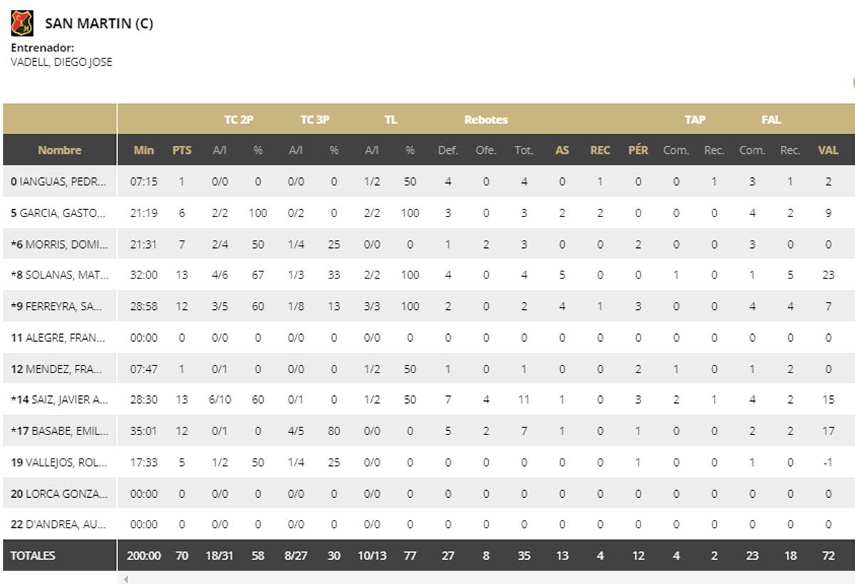 En el primer tiempo San Martín llegó a despegar hasta por nueve puntos con anotaciones de varias manos, hasta que promediando el tramo apareció Tabárez (18 tantos en la primera mitad) para poner al frente 39 a 37 a los de Gutiérrez con puntos a distancia y parcial de 12 a 0.