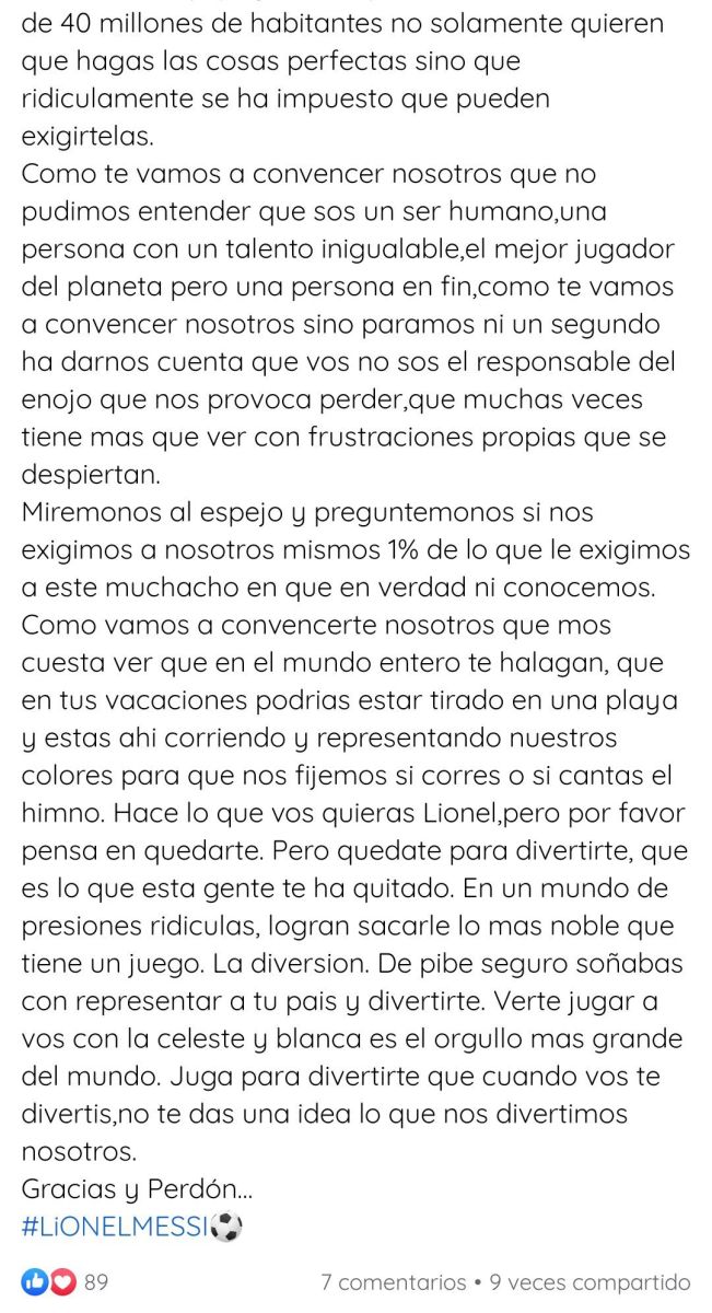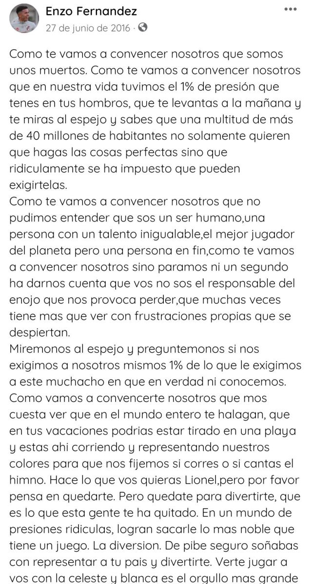 Enzo Fernández decidió publicar en su perfil de Facebook una carta donde intenta poner en valor todo lo que había hecho Leo Messi hasta aquel momento, donde había conseguido llegar a tres finales con la Selección (dos de Copa América y un Mundial). De hecho, perder la de 2016 fue lo que desembocó todo aquello.