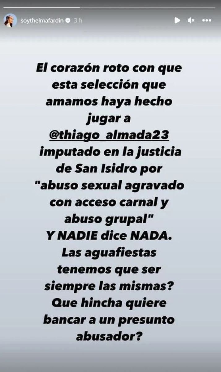 “El corazón roto con que esta Selección que amamos haya hecho jugar a Thiago Almada, imputado en la Justicia de San Isidro por ‘abuso sexual agravado con acceso carnal y abuso grupal. Y nadie dice nada’”, señaló la actriz en sus redes.