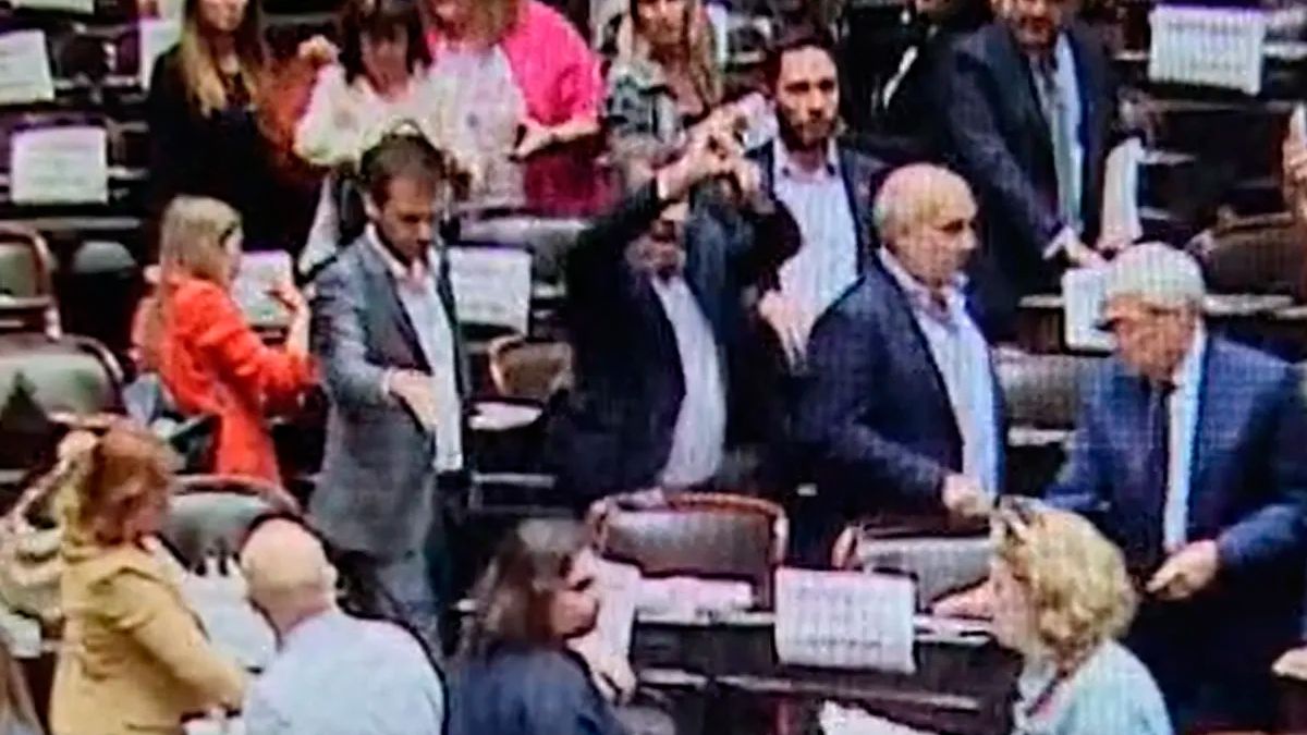 En una sesión marcada por los gritos, insultos y forcejeos, el jefe del bloque Pro en la Cámara baja tuvo un impropio gesto final para el oficialismo.