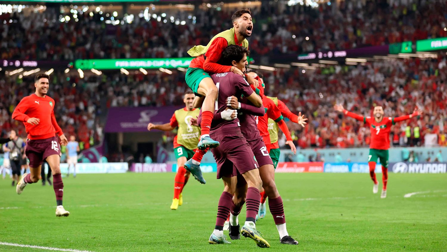El lateral Archaf Hakimi, compañero de Lionel Messi en París Saint-Germain, desató el delirio de más de 15.000 marroquíes enardecidos con una definición pinchada, homenaje al uruguayo Sebastián Abreu en los cuartos de Sudáfrica 2010.