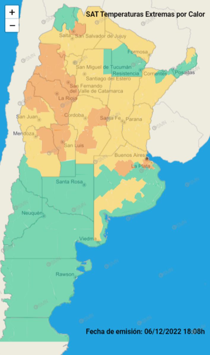 Por otro lado, el SMN continúa con alertas amarillas para la totalidad de las provincias de Salta, Formosa, Tucumán, Santa Fe y Entre Ríos, y para amplios sectores de Santiago del Estero, San Juan, San Luis, Mendoza, Córdoba, Corrientes, Misiones, Chaco y la provincia de Buenos Aires.