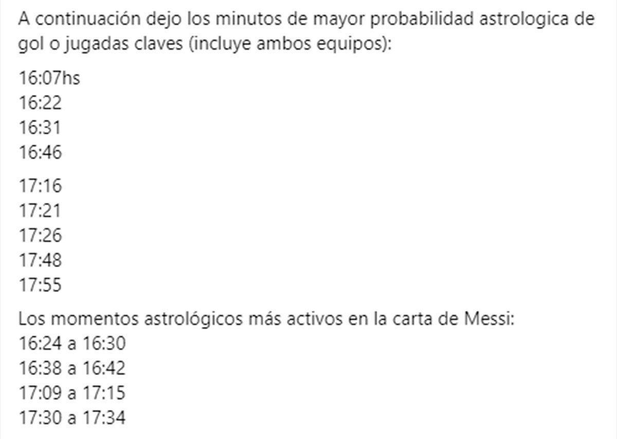 Juan Cruz Sirius comunicó a través de su cuenta de Facebook su predicción: “Los minutos de mayor probabilidad astrologica de gol o jugadas claves: 16:07, 16:22, 16:31, 16:46, 17:16, 17:21, 17:26, 17:48 y 17:55″, comenzó el astrólogo con su pronóstico.