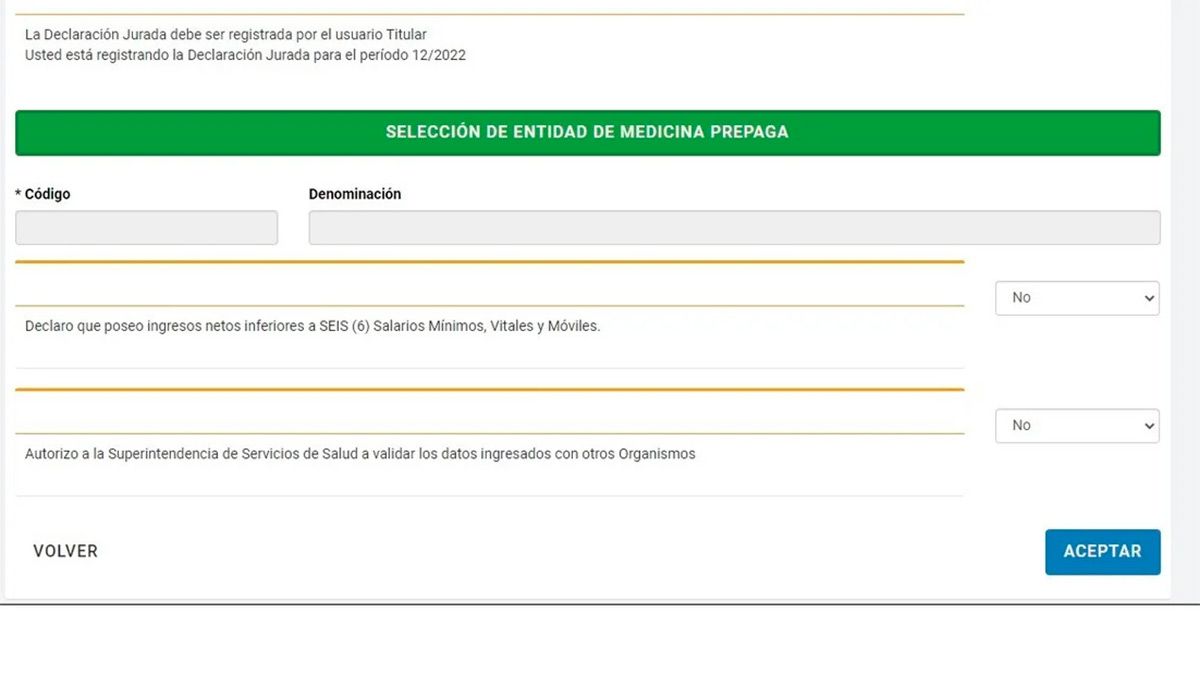 Una vez en la página de la Superintendencia, el afiliado deberá hacer clic en el acceso a "Declaración Jurada para Usuarios de Prepagas". Entre otros datos, deberá “confirmar” los casilleros que dicen: “Declaro que poseo ingresos netos inferiores a 6 SMVM” y, a continuación, “Autorizo a la SSSalud a validar los datos ingresados con otros organismos”.