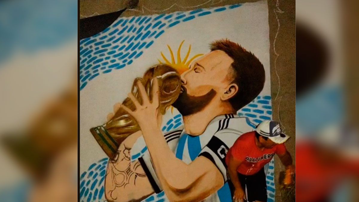 La pieza está ubicada en la calle Magallanes al 51, en la misma se puede observar al astro argentino Lionel Messi levantando y besando a la tan deseada Copa del Mundo, se estima que el artista culminará hoy la obra.