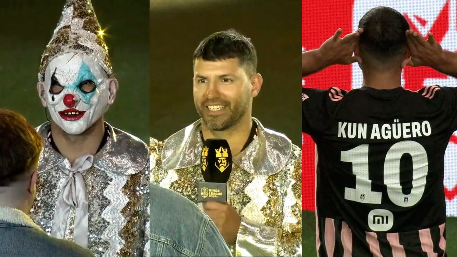 Se terminó el misterio. El Joker de la Kings League resultó ser nada menos que Sergio Agüero, retirado del fútbol profesional por un problema cardíaco. El Kun saltó este domingo al campo de juego vestido de payaso y se sacó la careta ante Ibai Llanos antes del partido entre Porcinos y Kunisports.