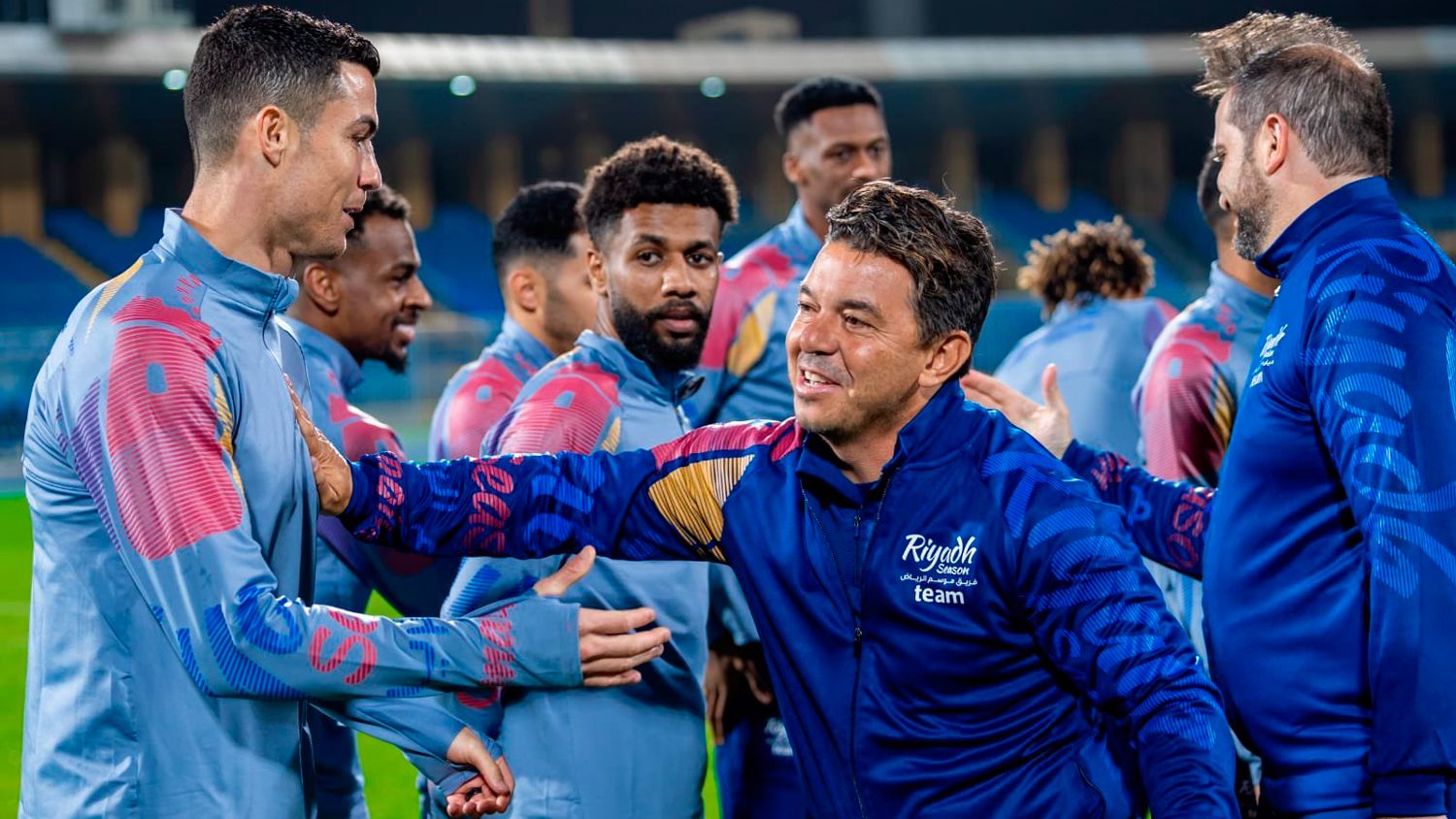 El entrenador ex River Plate, Marcelo Gallardo, que este miércoles cumplirá 47 años, y el crack portugués Cristiano Ronaldo se saludaron en su primer encuentro durante el entrenamiento para el partido amistoso entre estrellas de la liga saudí y París Saint-Germain de Francia, de Lionel Messi.