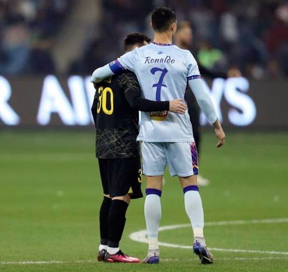 El saludo entre Messi y Cristiano se dio a segundos del arranque del partido, con un apretón de manos, un corto abrazo y sonrisas cruzadas, en lo que pudo ser uno de los últimos choques entre ellos.