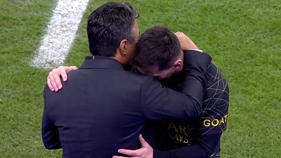 Cuando corrían los 17 minutos del complemento, Leo fue reemplazado al igual que varios de sus compañeros. Al pasar por el banco de suplentes, el ex entrenador de River aprovechó para darle un abrazo y decirle algunas palabras al oído.