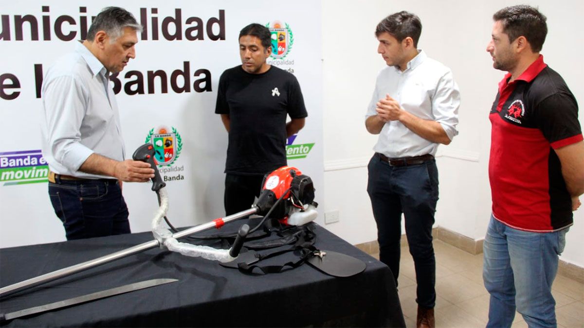 El intendente Roger Nediani junto al secretario de Coordinación y Desarrollo Territorial, Matías Nediani y el coordinador de la Oficina de Emprendedores, Marcelo Abraham, como parte del programa “Emprendiendo Sueños”, entregaron una motoguadaña LG 50 F y un machete al vecino Mario Medina del barrio Sarmiento de la ciudad de La Banda.