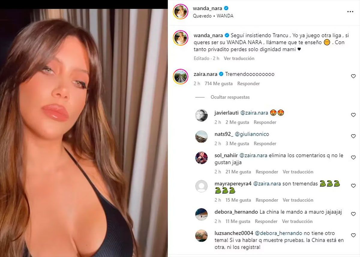 “Seguí insistiendo trancu. Yo ya juego en otra liga. Si querés ser su WANDA NARA llámame que te enseño. Con tanto privadito perdés solo dignidad, mami”, escribió la mediática en una publicación de Instagram. En el video que incluyó en el posteo, Wanda muestra su nuevo cabello castaño con el nuevo tema de Quevedo cuya letra la menciona.