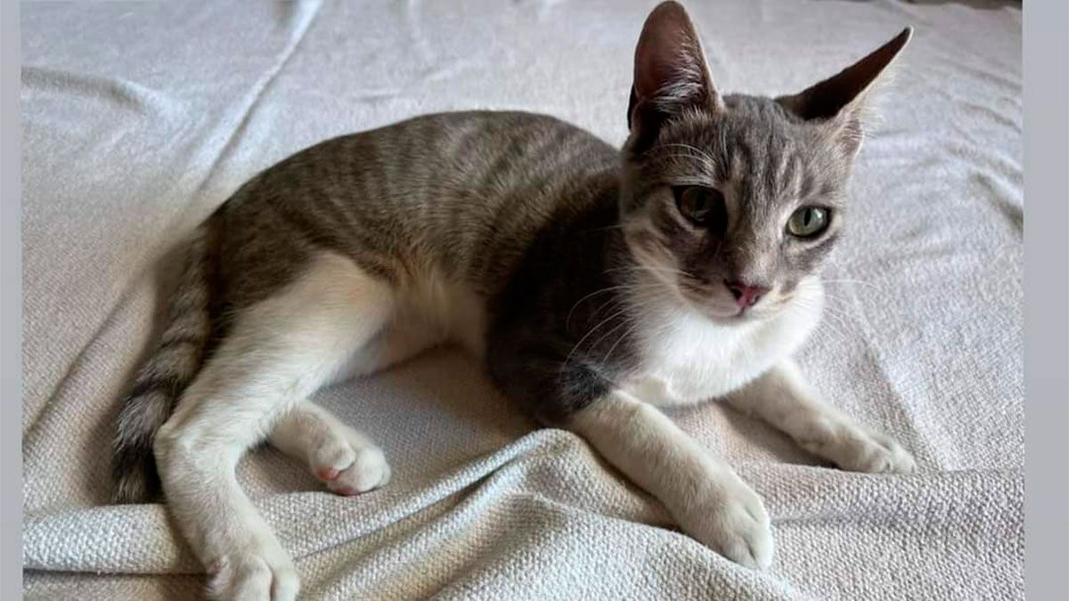 Se trata de un gatito cachorro, gris con patas blancas, no suele salir de su casa.