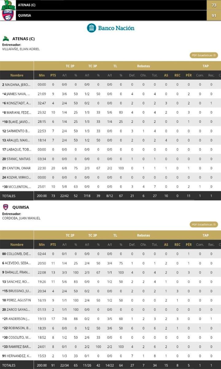El partido comenzó con un Atenas efectivo en ofensiva con Mcclenton en la pintura y el tiro externo de Blake para escaparse 14/7 ante un Quimsa tímido que iniciaba con una bomba de Ramirez Barrios y un par de dobles de Anderson. La Fusión comenzaba a mejorar de la mano de Anderson y un par de buenas defensas para acortar la brecha, pero llegó Cantón con ocho tantos al hilo para que el griego se lleve el primer cuarto por 22/16. En el segundo una ráfaga comandada por Jaimes y Sarmiento le permitía a los de Villafañe sacar una venta de +11 a su favor frente a un elenco santiagueño errático. Cuando parecía que Araujo ampliaba para los dueños de casa, llegaron las anotaciones de Acevedo y Brussino para meter en juego nuevamente a un Quimsa que con un libre de Robinson se iba al descanso arriba 40/39.