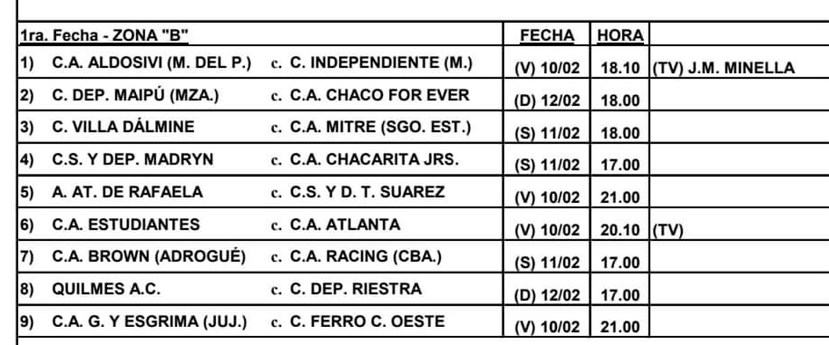 Este jueves se dio a conocer la programación de la primera fecha de la Zona B de la Primera Nacional, que tiene como representante santiagueño al Club Atlético Mitre.