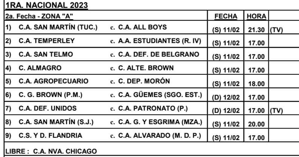 Lo que también se confirmó este jueves, fue la programación de la segunda fecha de la Zona A, que tendrá a Güemes visitando a Guillermo Brown de Puerto Madryn el domingo 12 de febrero a las 17.