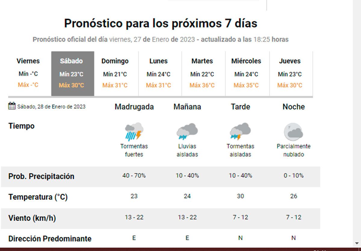 Las temperaturas bajas continuarían durante todo el fin de semana, ya que según el pronóstico extendido de dicho organismo, se esperan que las precipitaciones continúen hasta la madrugada del sábado, con 30° de máxima, mientras que para el domingo prevén 31°.