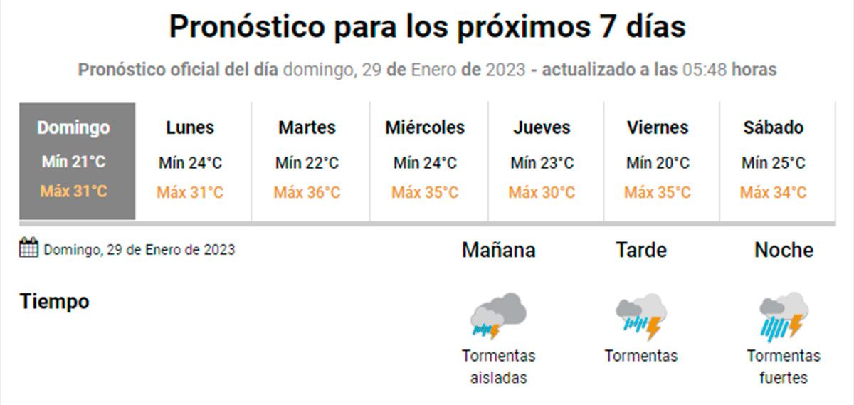 Por otro lado, se espera que la máxima de este domingo alcance los 31°. En tanto que para el resto de la semana, el pronóstico indica inestabilidad por cielo nublado y posibilidad de tormentas, mientras que la temperatura rondará entre los 22º y los 36º.