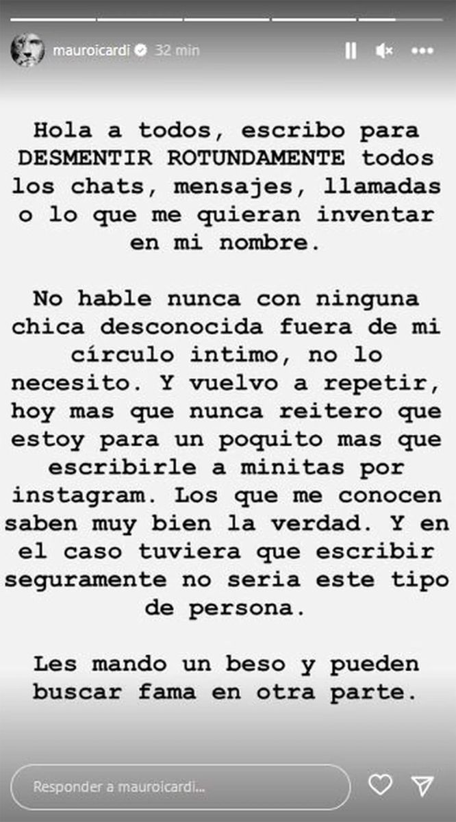En la última semana, salieron a la luz supuestos chats de Mauro Icardi con distintas mujeres. Pese a las capturas que circularon, él desmintió rotundamente la veracidad de las mismas. “Estoy para un poquito más que para escribirle a minitas por Instagram”, sostuvo.