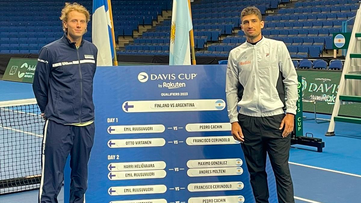 El tenista cordobés Pedro Cachín, debutante, enfrentará mañana a Emil Ruusuvuori en el inicio a la serie de Copa Davis que animarán la Argentina y Finlandia en la ciudad de Espoo, según lo determinó el sorteo del orden de juego efectuado hoy para la eliminatoria válida por los Qualifiers 2023 del tradicional certamen.