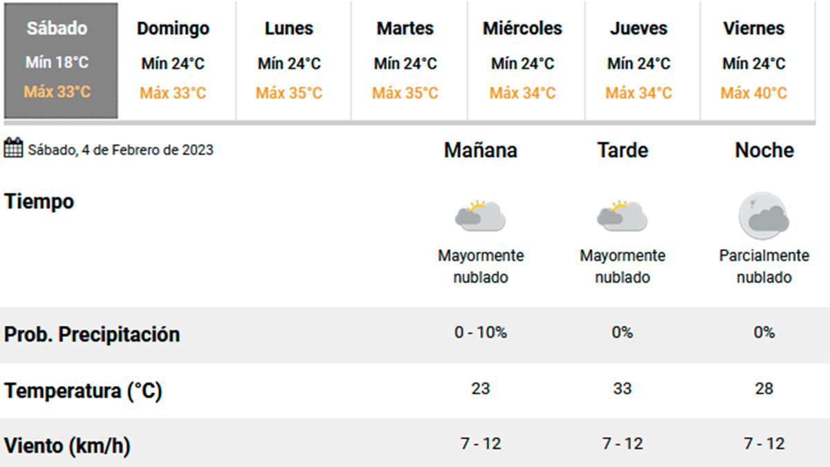 En el pronóstico extendido se puede observar cómo los registros irán en paulatino ascenso durante la semana entrante. El viernes, por ejemplo, se espera una máxima de 40 grados.