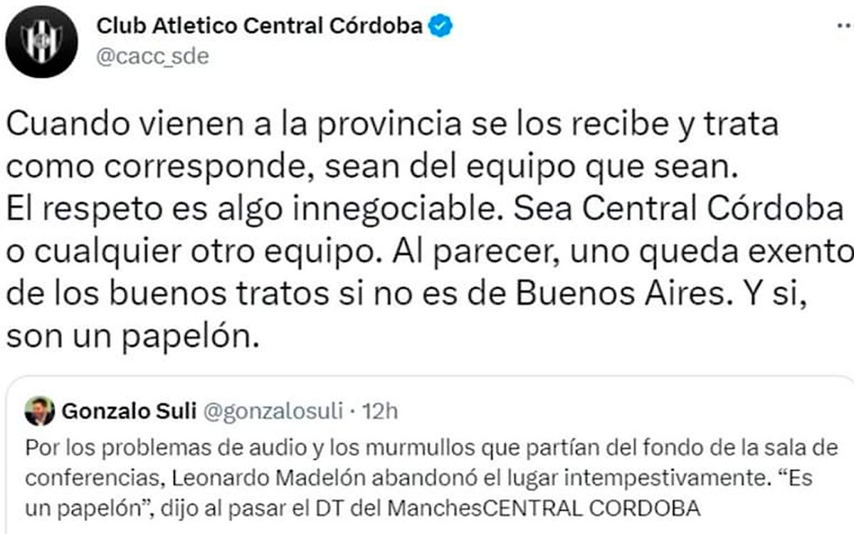 Tras lo sucedido, el periodista partidario de Boca y representante de Cadena Xeneize, Gonzalo Suli, posteó un polémico tuit, "Por los problemas de audios y los murmullos que partían de la sala de conferencias del fondo, Leonardo Madelón abandonó la sala intempestivamente. 'Es un papelón', dijo el DT del ManchesCENTRAL CÓRDOBA".