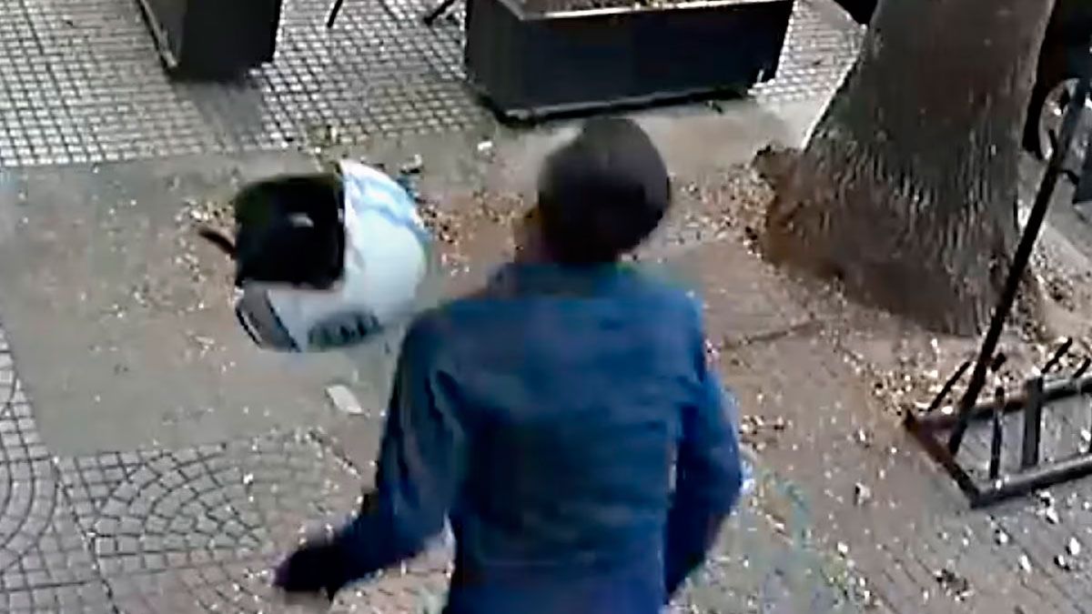 Video. Un comerciante le arrojó el elemento de protección al ladrón que trataba de huir. El impacto fue tal que lo tiró al piso.