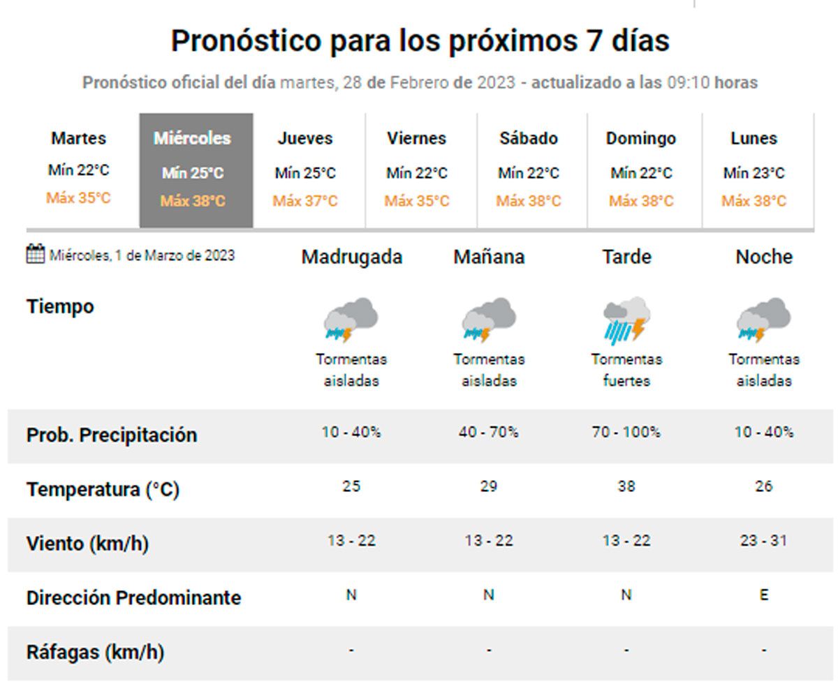 Así, el mes de marzo comenzaría con tormentas desde la madrugada, que se extenderían a lo largo del día. La mínima para el miércoles será de 25º y la máxima alcanzará los 38º; será un día pasado por agua, pero el alivio tendrá que esperar.